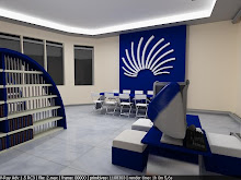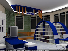 Ada 2 rak buku warna biru, dan putih dengan bentuk melengkung, dilengkapi dengan meja kursi resepsionis, meja dan kursi baca, saung lesehan untuk ruang baca. Rak buku dan majalah.
